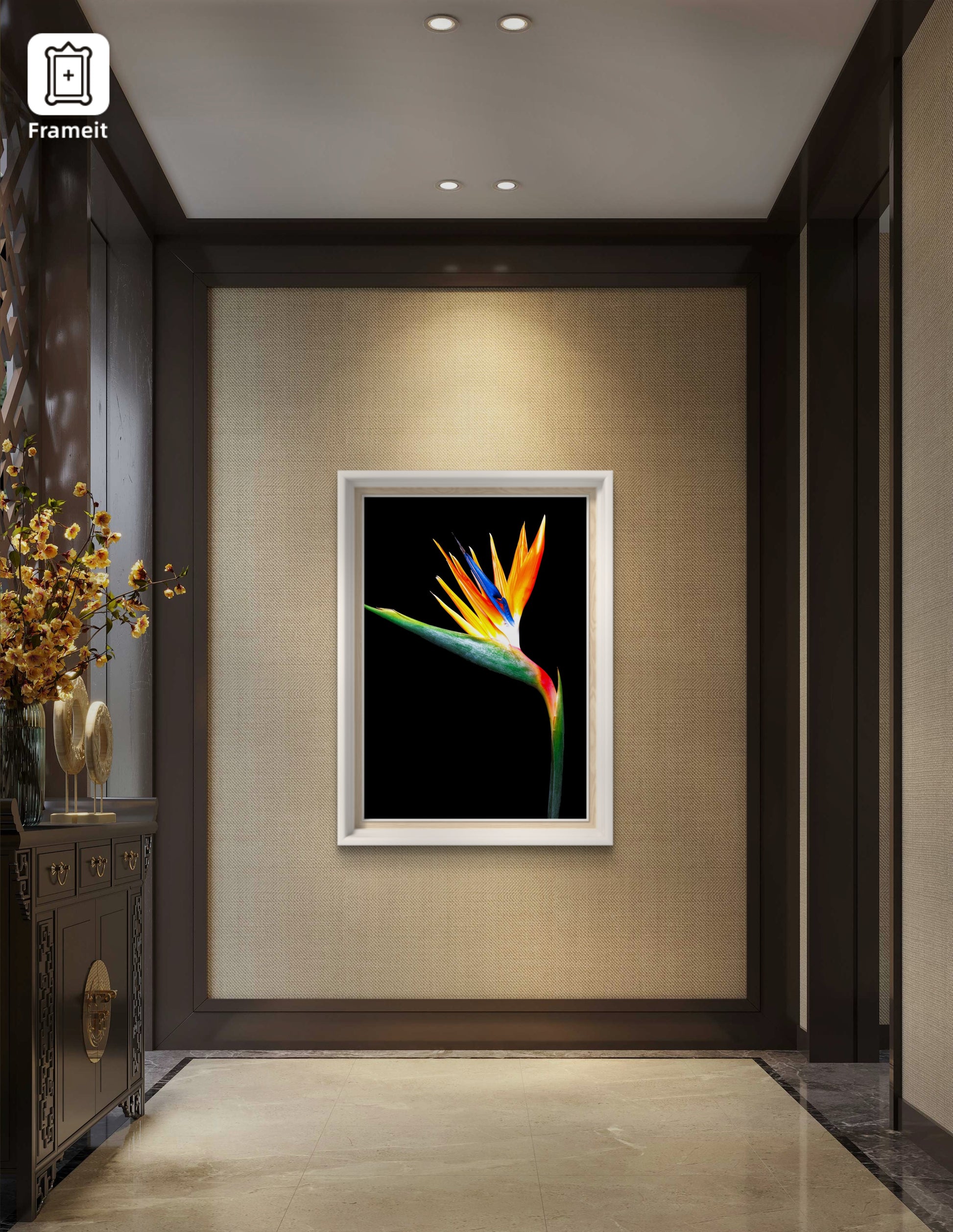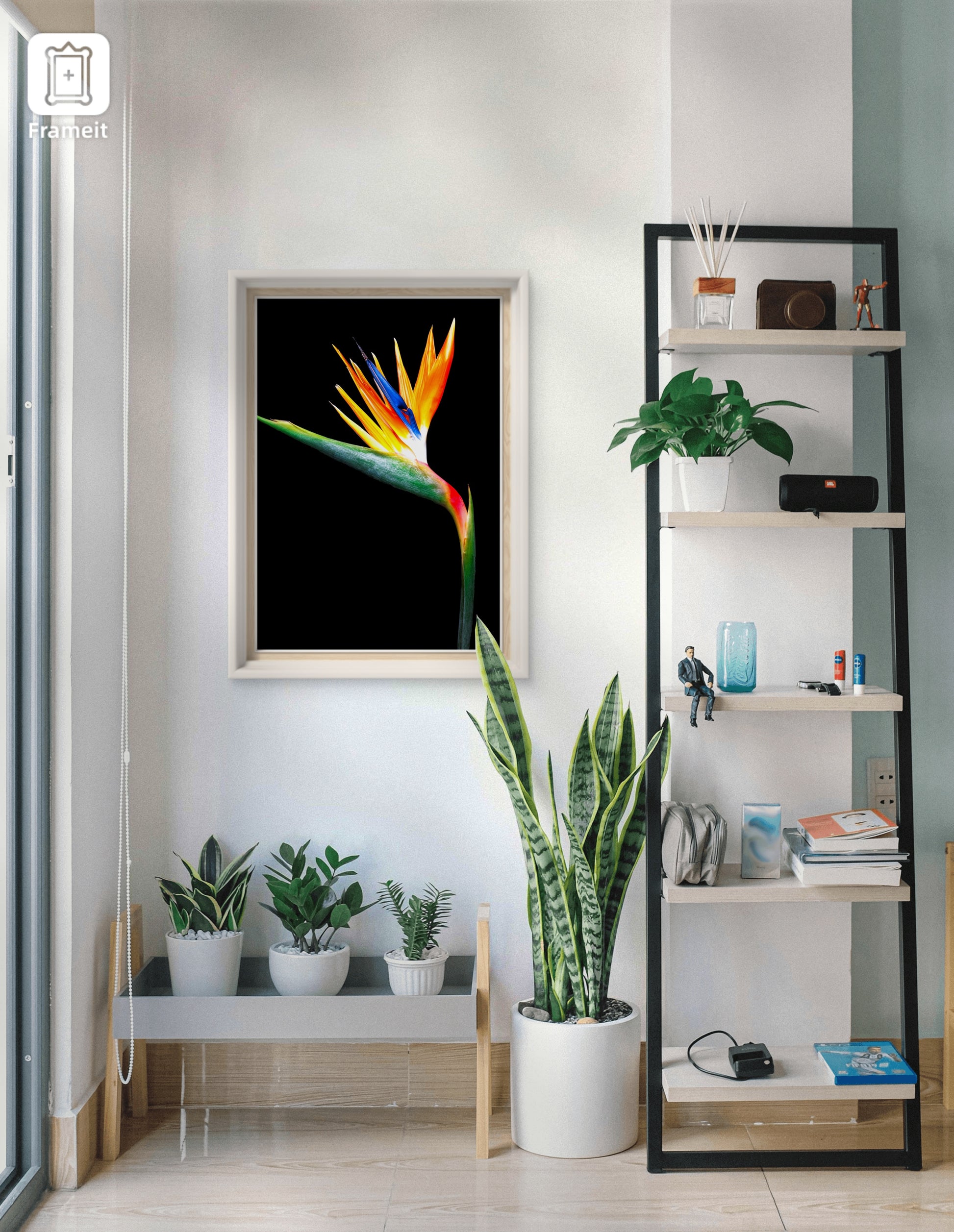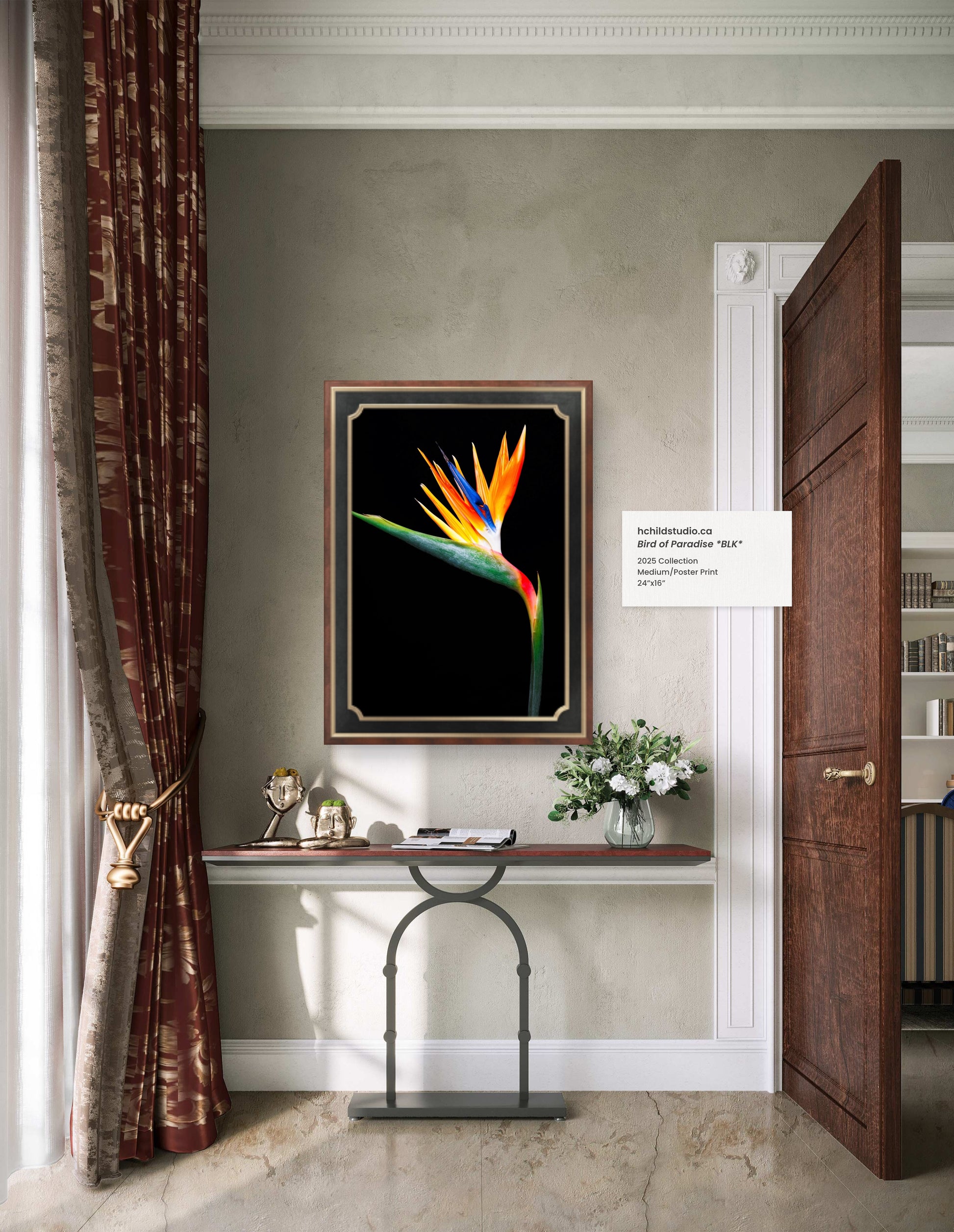 Set against a rich, deep black background, this striking Bird of Paradise flower takes center stage, its fiery orange and electric blue petals glowing with an almost sculptural presence. The dramatic contrast enhances every delicate curve and sharp detail, capturing the flower’s exotic allure and timeless beauty. A bold and sophisticated statement piece, this print brings a touch of the tropics and an air of luxury to any space. Perfect for those who appreciate nature’s artistry in its most vivid form.