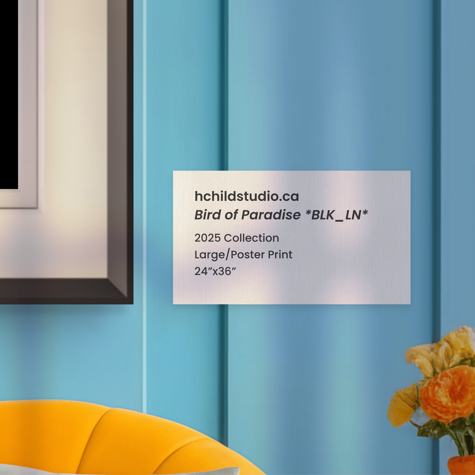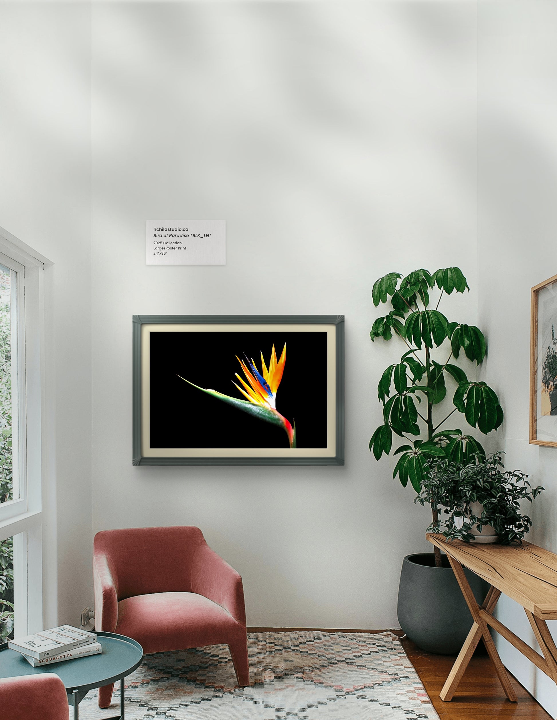 Captured in stunning detail against a deep black background, this Bird of Paradise flower stretches elegantly across the frame in a striking landscape composition. The fiery orange and vivid blue petals seem to glow, standing out with an almost three-dimensional presence. This dramatic piece highlights the flower’s sculptural beauty and exotic charm, making it a captivating focal point for any space. A perfect choice for those seeking a statement print that blends nature’s elegance with bold, modern artistry.